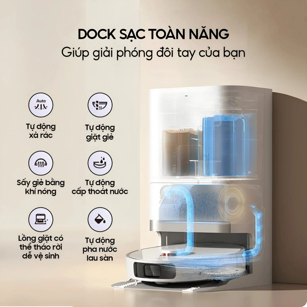 - Trạm sạc có tích hợp chu trình làm sạch tự động khép kín bao gồm tự động giặt và làm khô miếng lau để hạn chế ẩm mốc và ô nhiễm thứ cấp. Với dung tích siêu lớn đến 4 lít cho bình nước sạch và 4 lít cho bình nước dơ, người dùng cũng sẽ không cần phải thay nước thường xuyên.